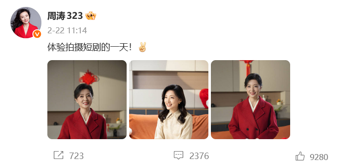 往前翻一翻,侯勇、李若彤、潘长江、巩汉林、寇振海、刘丹、王丽坤、万茜、杨蓉、舒畅、倪虹洁……一长串熟悉的名字,纷纷试水短剧。连知名主持人周涛,也在上周宣布踏足短剧。