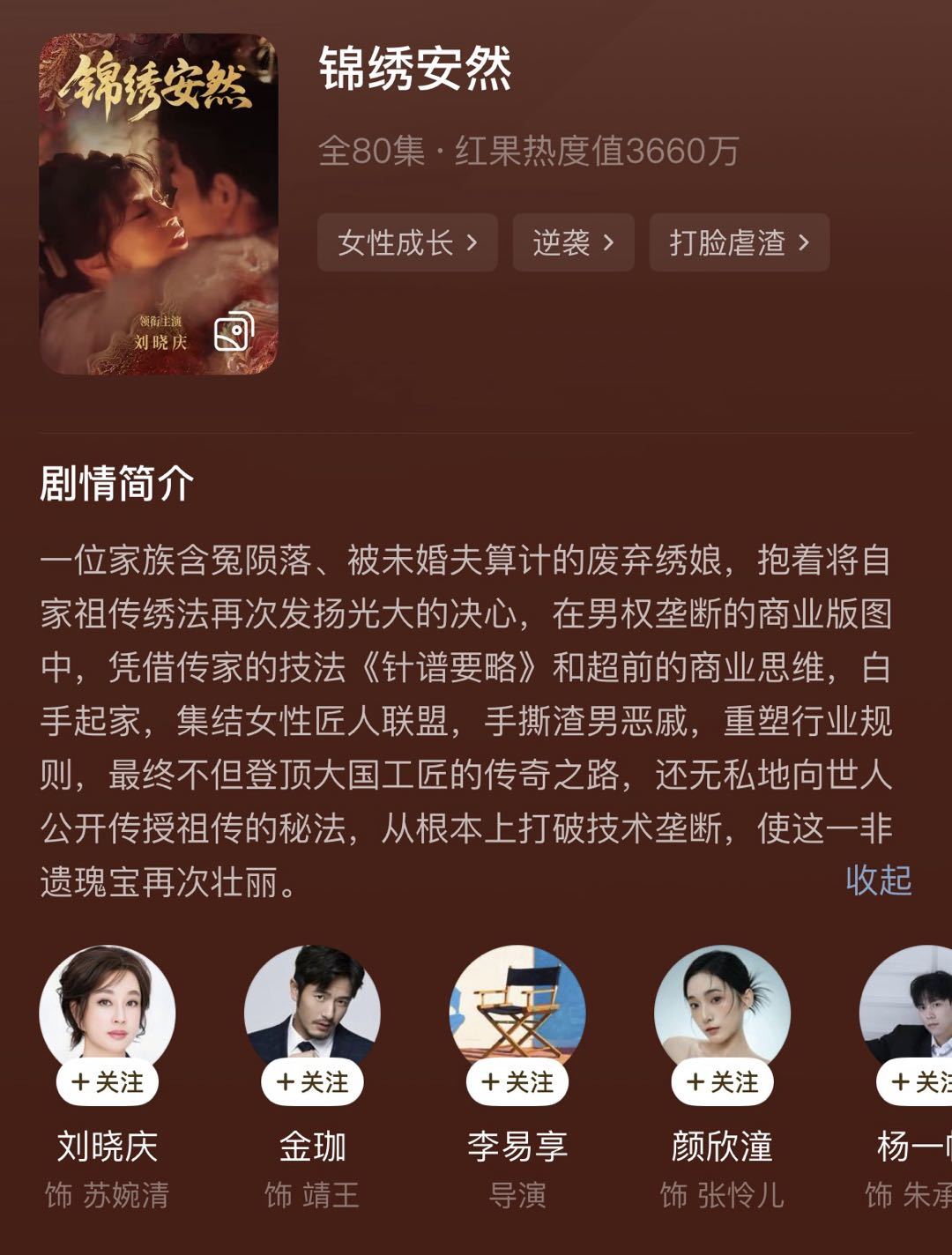 其实,从《锦绣安然》的剧情介绍看,故事不算“雷人”,用的是“女性成长”“逆袭”“打脸虐渣”的爆款配方,讲惨遭灭门的绣娘逆袭成大国工匠的故事。可惜的是,片方打的虽然是“女性传奇”的招牌,营销手段却是用吻戏引流,平台的剧情海报也是吻戏。